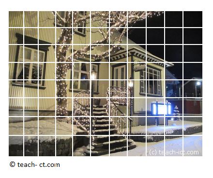 The picture has effectively been divided into 11 horizontal elements (columns) and 8 elements vertically (rows). This is what happens when an image is digitised - it is divided up into many individual elements.